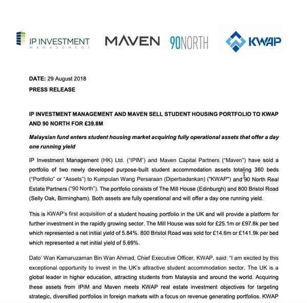 IPIM sponsors closed-end single asset real estate private equity funds and invests outbound client capital into direct real estate in developed overseas markets such as the US, UK, Europe, and Australia. The company seeks to generate attractive risk-adjusted returns by investing and proactively managing assets in sectors supported by strong demographic trends and markets with favorable fundamentals. Founded in early 2013, IPIM employs 17 professionals across 2 offices who currently manage a combined USD 379 million of assets (by GDV) and funded USD 129 million across 8 deals2. In Hong Kong, IPIM is regulated by the Hong Kong Securities & Futures Commission and holds both Type 9, and Type 4 licenses.  IPIM is regulated by the Monetary Authority of Singapore and holds a Capital Markets Services License (CMSL) in Singapore.  IPIM’s products are only available to both Professional and Accredited Investors in Hong Kong and Singapore respectively.